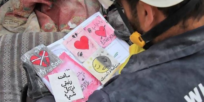 Enkaz kaldırma çalışmaları yürüten bir grubun enkazdan çıkardıkları günlük Beyaz Baretliler’e ait Twitter hesabından defteri bulan kişinin şu notuyla paylaşıldı: “Defterlerin görüntüsü içimi yaktı. Aman Allah’ım, çocuklarımı hatırladıkça tüm dünyanın yükü göğsüme çöktü.”