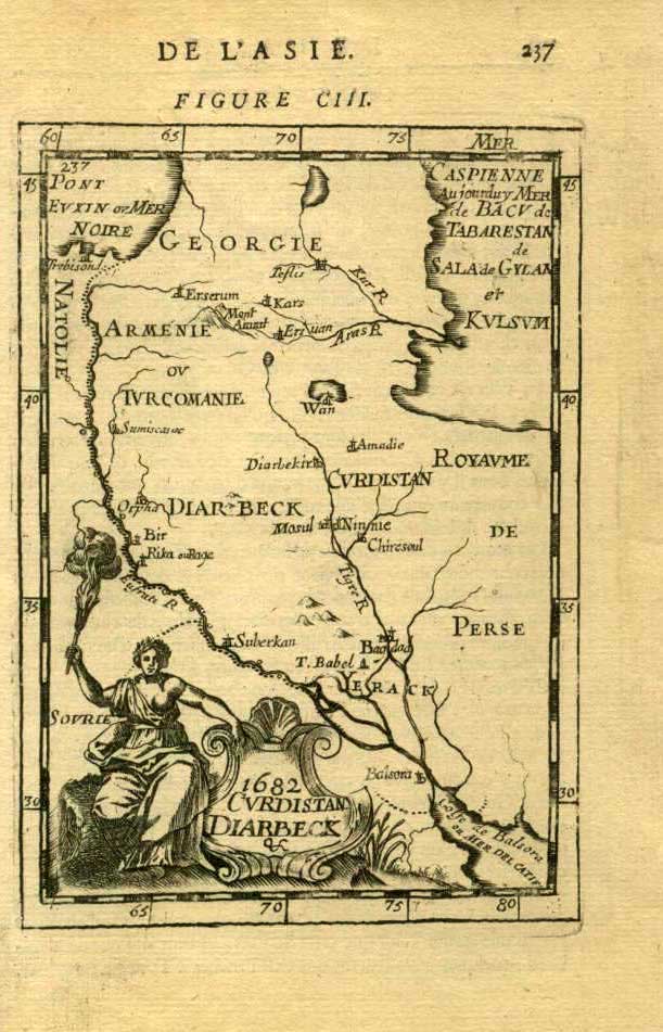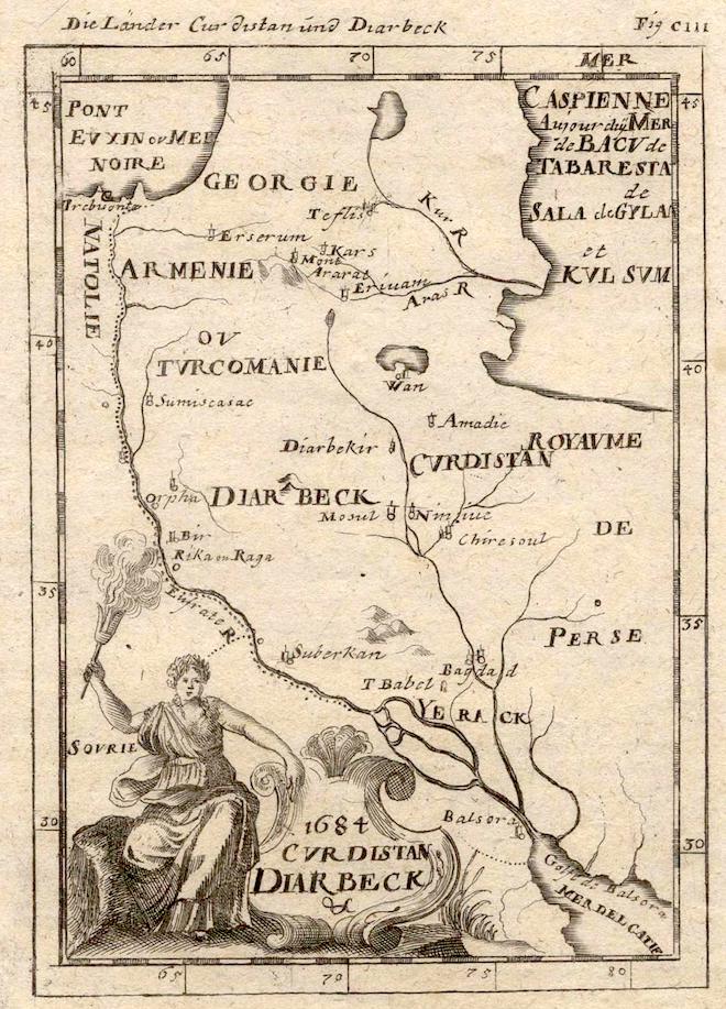 Bilinen en eski harita, Fransalı kartograf ve mühendis Alain Manesson-Mallet’ye ait. Öncesinde de Doğu dünyasında 'Belad-ı Ekrad', 'Arz-ul Ekrad' isimleriyle Batı dünyasında da 'Curdi', 'Gordeni' isimleriyle haritalarda kendine yer bulan Kürtlerin diyarı, en son adı ile yani Kürdistan ismiyle ilk kez 1682 yılında Fransızca basılan kitabında yer aldığı haritada var. Alain Manesson-Mallet’nin, doğu ülkelerine hiç seyahat etmediği biliniyor. Buna göre o dönemki yazılı kaynaklardan ve seyyahların anlatımından yola çıkarak bu haritayı çizdiğini düşünebiliriz. Haritada Kanunî’nin Fransa kralına gönderdiği mektubunda zikrettiği gibi Diyarbekir ve Kürdistan iki ayrı ülke olarak var. Zira o yıllarda Diyarbekir, Osmanlı idari yapısına bağlı bir eyalet statüsündeydi.