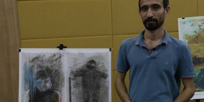 - Ressam Ercan Altuntaş, mültecilerin “umuda yolculuk” diye çıktıkları engelli yollarda yaşadıklarını resmediyor.