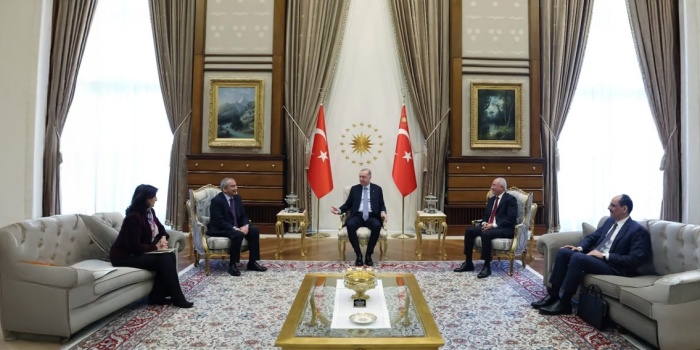 Heyet, daha sonra Saray'a gitmek üzere yolla çıktı. Heyet ile Erdoğan arasındaki görüşme saat 13.30’da başladı. Basına kapalı gerçekleştirilen görüşmede, AKP Genel Başkanvekili Efkan Ala ile MİT Başkanı İbrahim Kalın da yer aldı. Görüşme, 1 saat 25 dakika sürdü.