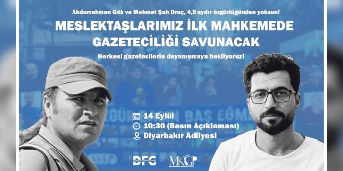 - Gazeteciler ve DFG, İHD ve DBP tutuklu gazeteciler Abdurrahman Gök ve Mehmet Şah Oruç’un 14 Eylül’de görülen duruşmasına destek verilmesi amacıyla katılım çağrısı yaptı.