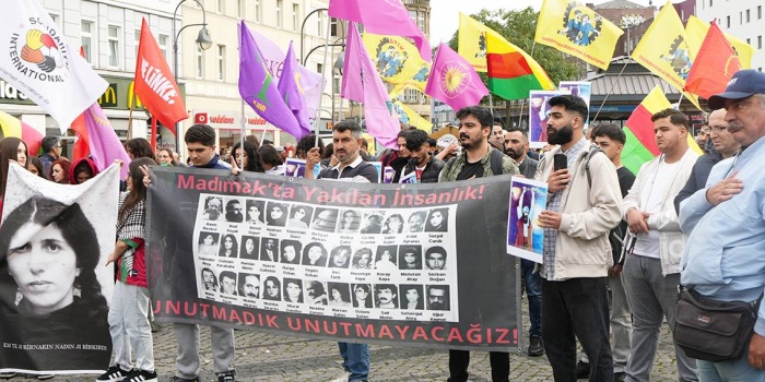 Sivas’ta Madımak Oteli'nde 2 Temmuz 1993’te yakılarak katledilen 33 aydın, katledilmelerinin 31'inci yıl dönümünde Almanya'nın başkenti Berlin'de anıldı. Anma etkinliğine katılan Kürtler, Türkiyeli devrimci demokratlar ve dostlar, katillerin halen Almanya’da serbestçe gezmesine tepki gösterdi.
