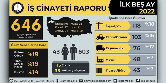 - İSİG’in raporuna göre, 2022’nin ilk 5 ayında 646 işçi, iş cinayeti sonucu yaşamını yitirdi.