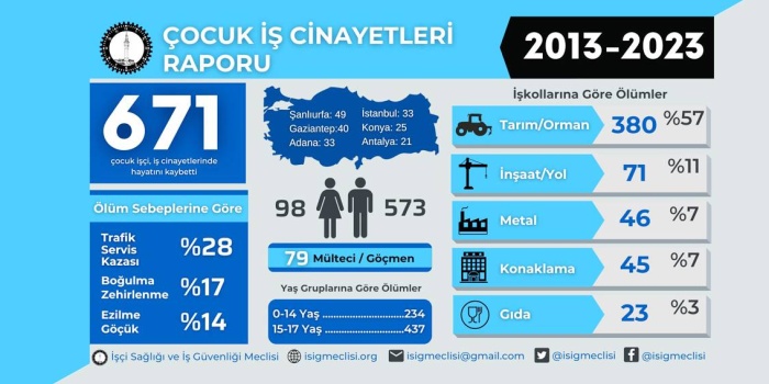 - İşçi Sağlığı ve İş Güvenliği Meclisi'nin (İSİG), paylaştığı Çocuk İşçilik Raporu'na göre; son 11 yılda en az 671 çocuk çalıştırılırken iş cinayetlerine kurban verildi.
