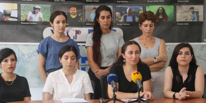 Dicle Fırat Gazeteciler Derneği’nde (DFG) yapılan basın toplantısına DFG Eşbaşkanı Dicle Müftüoğlu ve kadın gazeteciler katıldı. Hazırlanan raporun Türkçesini gazeteci Habibe Eren okurken, Kürtçesini MGKP Sözcüsü Roza Metina okudu.