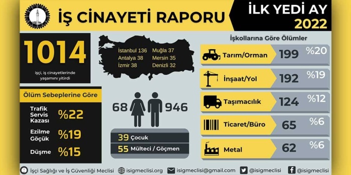 İşçi Sağlığı ve İş Güvenliği Meclisi tarafından paylaşılan ‘Temmuz Ayı İş Cinayetleri Raporu’nda, “Yüzde 67'sini ulusal basından; yüzde 33'ünü ise işçilerin mesai arkadaşları, aileleri, iş güvenliği uzmanları, işyeri hekimleri, sendikalar ve yerel basından öğrendiğimiz bilgilere dayanarak tespit ettiğimiz kadarıyla 2022 yılının ilk yedi ayında en az 1014 işçi hayatını kaybetti” ifadeleri ile hayatını kaybeden işçilere ilişkin bilgiler açıklandı.