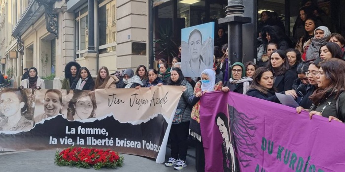 Avrupa Kürt Kadın Hareketi (TJK-E) 8 Mart’ın startını Paris’te 23 Aralık’ta 3 kişinin katledildiği Demokratik Kürt Toplum Merkezi önünde verdi. Avrupa’nın değişik kentlerinde gelen kadın meclisleri ve eşbaşkanların katılımı ile yapılan basın açıklamasında TJK-E, bu yılki 8 Mart eylem ve etkinliklerini Paris’te katledilen Evîn Goyî’ye adadığını duyurdu.