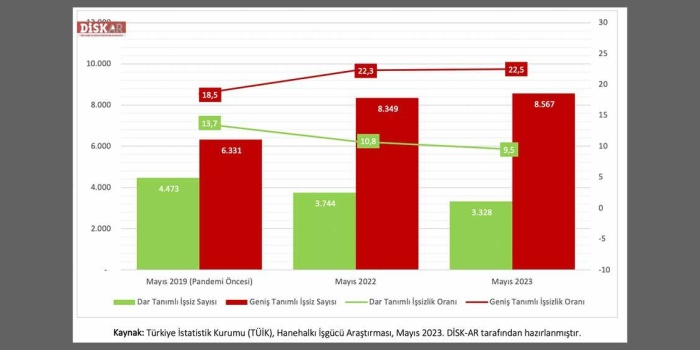 TÜİK’e göre; Mayıs 2019'da yüzde 13,7 olan dar tanımlı işsizlik, Mayıs 2023’te yüzde 9,5 olarak gerçekleşti. Ancak aynı yıllarda geniş tanımlı işsizlik yüzde 18,5’ten yüzde 22,5’e yükseldi. Böylece küresel salgın sonrası geniş tanımlı işsizlik oranı 4 puan, geniş tanımlı işsiz sayısı ise 2,2 milyon arttı.