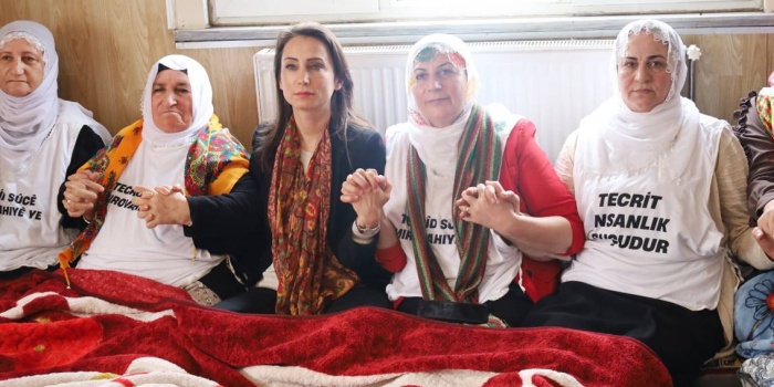 Ardından söz alan Tülay Hatimoğulları, nöbet eyleminde yer alan tutsak yakınları ve mücadelelerini selamlayarak konuşmasına başladı. Öcalan’ın özgürlüğü için yapılan eylem ve etkinliklerin önemine değinen Hatimoğulları, şunları söyledi: “İmralı tecridinin kaldırılması ve İmralı’dan Türkiye’nin dört bir yanına yayılmış tecrit rejiminin sonlanması için bugün Kurdistan’ın dört bir yanında eylem ve etkinlikler başlatılmış durumda. Cezaevlerinden açlık grevinde olan tutukluların yaptıkları açıklamalara baktığımızda süresiz ve dönüşümsüz açlık grevlerine seçimlerden sonra başlayabileceklerini belirtiyorlar. Cezaevlerindeki bu durum ağırlaşmadan, Türkiye’nin içinde bulunduğu bu karanlık tablodan çıkılması için adım atılmalı. Bakın yine burada annelerimiz ‘Adalet için tecridi kıralım, toplumsal barış için zindanlara ses olalım’ şiarıyla eylemlerini sürdürüyor. Bunu Türkiye’de ki tüm halkların duyması özellikle de Türk annelerin duyması lazım. Bugün çocuğu kargo kutusunda teslim edilen bir anne ‘barış istiyorum’ diyorsa bunu tüm asker anaları da duymalı.”