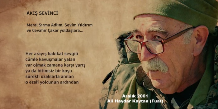 Ali Haydar’dır. Yolcu iken yolun kendisi olan ve devri âlemde semah çeviren turnaların şahı. Bizi bu divana pervane eden ve zamanın sonsuzluğuna âşık eden Ali Haydar. Dört bin yıl sonra bize bir akarsu getiren ve çiçeği konuşturan Haydar. Yaralı turnaları saran ve acıya yoldaş olmayı öğreten dergâh.