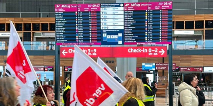 Berlin Brandenburg Havalimanı uyarı grevi nedeniyle Perşembe günü hiçbir kalkışın yapılamayacağını açıkladı. Yolculardan uçak şirketleriyle iletişime geçerek biletlerini açığa almaları ve alternatif seyahat imkanlarıyla ilgili bilgi edinmeleri istendi. Uçuş güvenliği branşı, yolcu kontrolü, yolcu ve eşya kontrolü, kargo kontrolü ve servis alanlarında çalışan personeli kapsıyor. Verdi 2023 yılında güvenlik personelindeki grevlerle birçok havalimanını felce uğratmıştı.