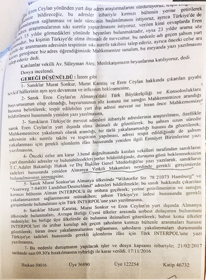 2017’de sanık hakında suç duyurusunda bulundum. Bayern eyaleti sınırları içerisinde bulunan Coburg savcılığı Songur’a ‘onların izni olmadan adres değiştirmeme ve adresinde kalma zorunluluğu’ getirdi. Ben bu durumu avukatlar üzerinden Ankara Ağır Ceza Mahkemesi’ne beyan ettim. Murat Songur’un adresini mahkemeye bildirerek, ‘Koburg Neu-Stadt denilen bir kasabada yaşıyor’ dedik.