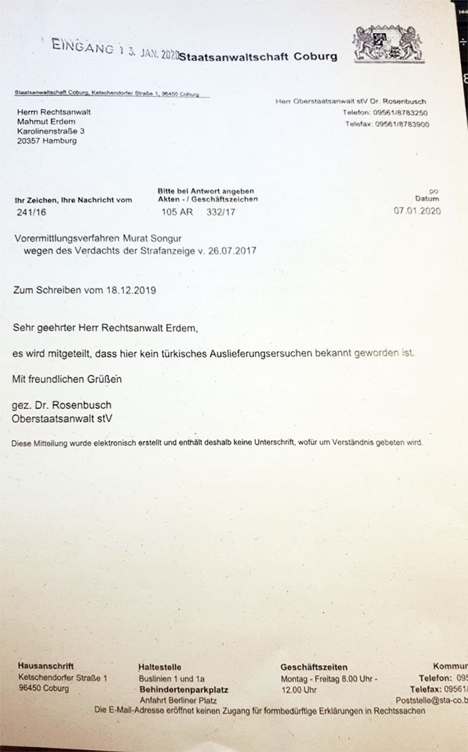 Bunun özerine Ankara 1. Ağır Ceza Mahkemesi, ‘Songur’un iadesini talep ediyoruz’ dedi. 2017 tarihli karar elimizde. Mahkemenin bu açıklaması üzerine Almanya’da iade talebinde bulunulması gerekiyor. Şimdi 2020’deyiz ve aradan geçen 3 sene içerisinde Coburg Savcılığı’na Türkiye’nin iade talebi gelmedi. Yaptığım başvuru üzerine Coburg Savcılığı 7 Ocak 2020 tarihli cevabında Songur’a ilişkin herhangi bir iade talebinin ellerine ulaşmadığını aktardı. Kısacası bu kişi hakkında 2-3 senedir bir iade talebine ilişkin herhangi bir yazı gönderilmemiş.