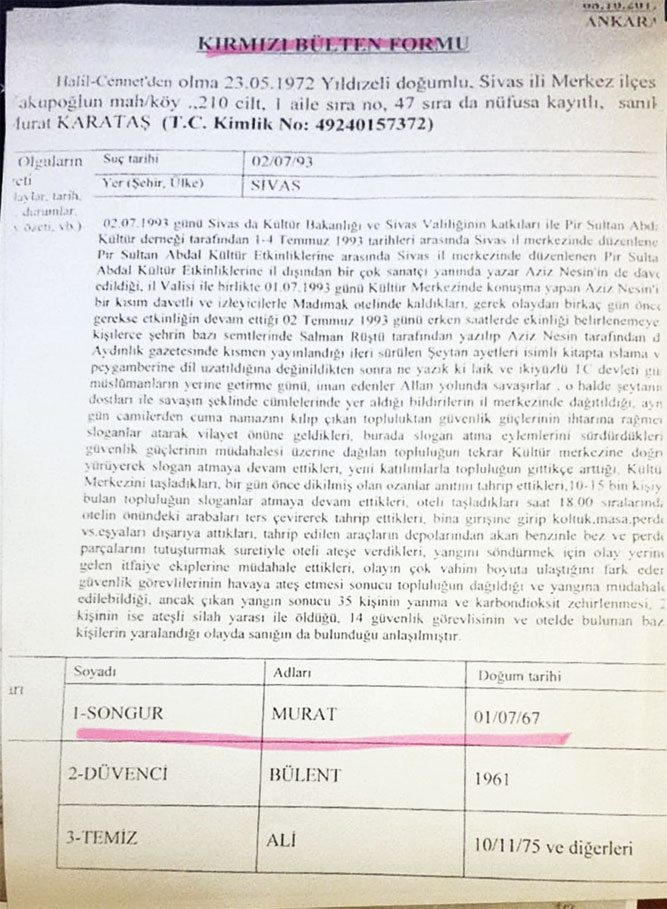 2016’da bana Murat Songur’un, Hamburg’un Harburg ilçesinde yaşadığı yönünde bir bilgi geldi. Madımak Katliamı mağduru ailelerin avukatlarıyla görüşerek bu konu hakında herhangi bir bilgiye sahip olup olmadıklarını sordum. Bu yönlü bir bilgiye sahip olmadıklarını söylediler. Tam tersine mahkemenin kendilerine ‘bu kişilerin kimlikleri ve adresleri belli değil ve Kırmızı Bülten’le arandıkları belirtiliyor’ dediler.