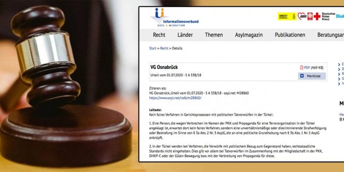 İltica Bürosu BAMF bir Kürt mültecinin iltica başvurusunu 'Türkiye'de verilen ceza, hukuk devletinin işleyişidir' gerekçesiyle reddetti. Osnabrück İdari Mahkemesi ise BAMF kararını "Türkiye'de hukuk devleti işleyişi yok, yeniden görevlendirilen savcı ve hakimlerin büyük oranda AKP'yle bağı var" diyerek reddetti. Mahkemenin "5A338/18" nolu dosyaya ilişkin kararı 1 Temmuz tarihli.