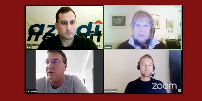 Civaka Azad tarafından organize edilen "PKK yasağına karşı ne yapmalı" konulu online panele Cumhuriyetçi Avukatlar Derneği (RAV) Başkanı Avukat Lukas Theune, Schleswig-Holstein Eyalet Parlamentosu’nda SSW Başkanı Lars Harms ile Azadî Hukuki Bürosu’ndan Monika Morres konuşmacı olarak katıldı. PKK yasağının arka planı ve sonuçlarının tartışıldığı panelde yasağın kaldırılması için nasıl bir yol izlenebileceği tartışıldı.