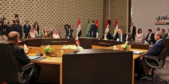 Ürdün Dışişleri Bakanı Eymen es-Safedi, Suudi Arabistan Dışişleri Bakanı Faysal bin Ferhan, Mısır Dışişleri Bakanı Samih Şukri ve Irak Dışişleri Bakanı Fuad Hüseyin, Suriye'deki Beşşar Esed rejiminin Dışişleri Bakanı Faysal el-Mikdad ile Ürdün'ün başkenti Amman'da görüştü. Basına kapalı gerçekleşen toplantının ardından yayımlanan sonuç bildirgesinde, "Ürdün, Suudi Arabistan, Irak ve Mısır dışişleri bakanları, Suriye krizi ile onun uluslararası ve bölgesel yansımalarının tümüyle bitmesine öncelik verdiklerini teyit etti" ifadeleri kullanıldı.