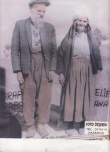 Atê Elif ve eşi Araw. Pazarcık’ta anneler için Kürtler Atê diyorlar. Elif Ana gibi ermiş kadınlara ise bütün toplum Atê demektedir. Atê aynı zamanda geçmişte Kilikya’daki bir bereket tanrıçasının da adıdır.
