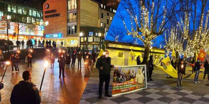 Merkezi tren garı önünde toplanan halk, öncülüğünü TCŞ’nin yaptığı eylemde meşaleler taşıdı. Alman Kürdistan dostlarından Anti-Fa da eyleme destek verdi. Eylemde sık sık "Bijî Serok Apo", "PKK halktır, halk burada", "Kürdistan faşizme mezar olacak", "Katil Erdoğan", "İşbirlikçi KDP" sloganları atıldı.