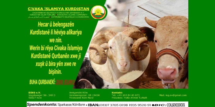- Civaka Îslamiya Kurdistan (CÎK), her yıl olduğu gibi bu yıl da Kurban Bayramı’nda dayanışma ve paylaşımı büyütmek için kampanya yürütüyor. Kurban bedelini 200 Euro olarak belirleyen CÎK, bu sene topladıkları bağışları Kuzey ve Doğu Suriye Özerk Bölgesi ve Mexmûr’daki ihtiyaç sahiplerine ulaştıracak.