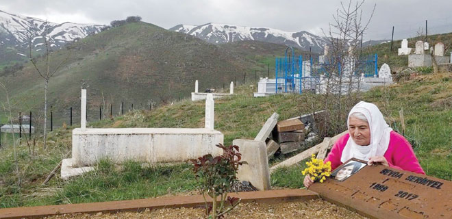 Türk devletinin Kürt düşmanlığı, mezara kadar eşlik ediyor, mezara da kötülükle devam ediyor. Havadan bombalayarak, kepçelerle girerek, hatta Garzan’da olduğu gibi cenazeleri de kaçırarak mezarlıkları yok eden Türk devleti, bir süredir de tek tek mezarları dolaşıp tahrip ediyor, bazen de ailelerinden tahrip edip fotoğraflamalarını ve getirip takdim etmelerini istiyor. Son olarak Bingöl’de mezar taşlarına saldırıldı, Gever’deki mezarlığı 7. kez tahrip etti. Kızı Sevda Serinyel’in Bingöl’deki mezarının askerler tarafından tahrip edilmesine karşı mezar başında nöbet tutan Hakife Serinyel, “Hangi dinde böyle bir şeyin yapıldığı görülmüş? Bize yapılan bu zulmü kabul etmiyoruz” dedi.