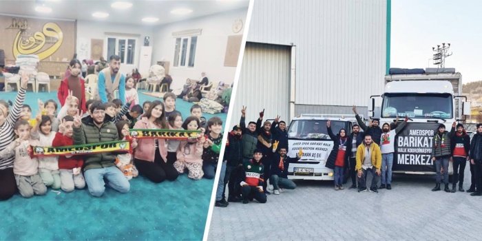 - Amedspor’un taraftar grubu Barikat, Maraş merkezli depremde sadece Amedli depremzedelere değil Adıyaman, Hatay, Maraş, Adana gibi tüm deprem bölgelerine yetişmeye çalıştı.