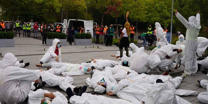 Beyaz tulumlar giyen Kürt ve enternasyonalist gençler, Türk devletinin kimyasal saldırı ve katliamlarına dikkat çekmek için beyaz tulumlar giydi. Gençler burada Medya Savunma Alanları’nda gerçekleştiren saldıları temsilen bir tiyatro da sergiledi. Oyunda sirenlerin çalması ile beraber sarı renkli gazlar yayılmaya başladı. Gazların salınımı ile birlikte beyaz tulum giyen eylemciler yere yattı. Eylemcilerin dakikalar boyunca yerde yattığı sırada ise sık sık “Zap, Avaşin, Metina” ve “Bijî Berxwedana Gerîla” sloganları atıldı. Göstericilerin mekap ayakkabılarıyla zafer işareti yapması da dikkat çekti.
