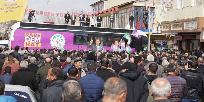 Bakırhan, şu çağrıyla konuşmasını tamamladı: "Sakın, ‘Zaten burayı kazanıyoruz’ demeyin. Tam tersine gitmediğiniz ev, çalmadığınız kapı kalmasın. Kop’ta rekor bir oy, kayyumcu anlayışa büyük bir cevap olsun. Bu vesileyle diğer siyasi partilerde siyaset yapan Kürtlere de çağrı yapıyorum; aday olduğunuz parti, Meclis’te bize hakaret ediyor, sesimizi kısıyor. Şêx Seîd Efendi’ye yapmadığı hakaret kalmadı. Aday olduğunuz AKP, Kürtlerin yaşadığı her yere ‘teröristan’ diyor. Hepinizi DEM Parti’ye davet ediyorum.” MÛŞ