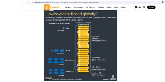 - Dünyanın tüm servetinin yüzde 47’si toplam nüfusun yüzde 1,5’unun elinde, dünya nüfusunun yüzde 33’ü toplam servetin binde beşi ile yaşıyor. Açıklanan 2024 Küresel Servet Raporu Kapitalist sefaleti belgeledi.