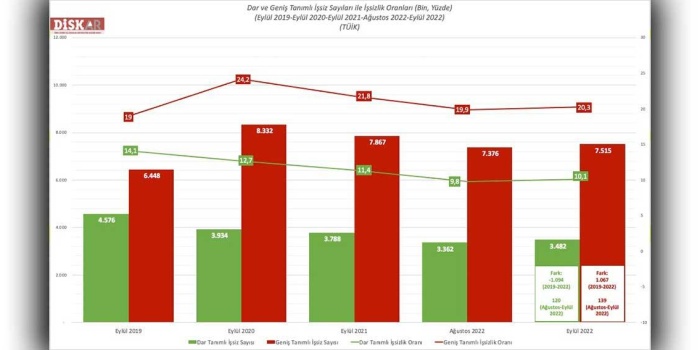 DİSK-AR tarafından TÜİK verilerinden yararlanarak yapılan hesaplamaya göre; mevsim etkisinden arındırılmış geniş tanımlı işsiz sayısı ise Eylül 2022’de 7 milyon 515 bin kişi olarak gerçekleşti. TÜİK’e göre; Eylül 2019’da yüzde 14,1 olan işsizlik Eylül 2022’de yüzde 10,1 olarak gerçekleşti. Ancak aynı yıllarda geniş tanımlı işsizlik yüzde 19’dan yüzde 20,3’e yükseldi.