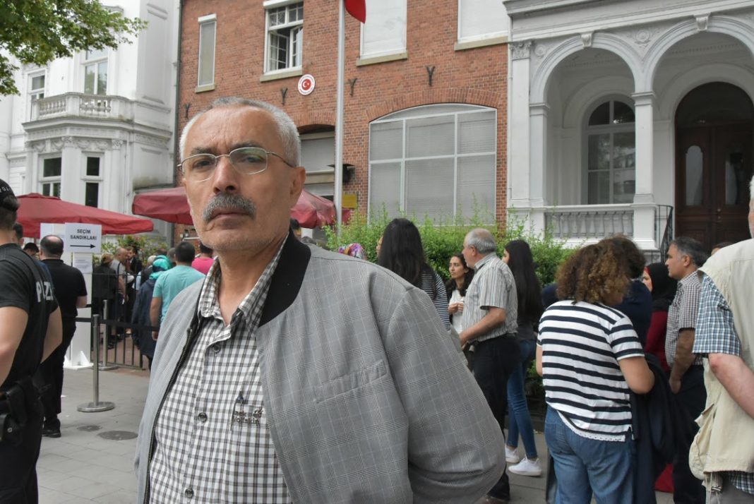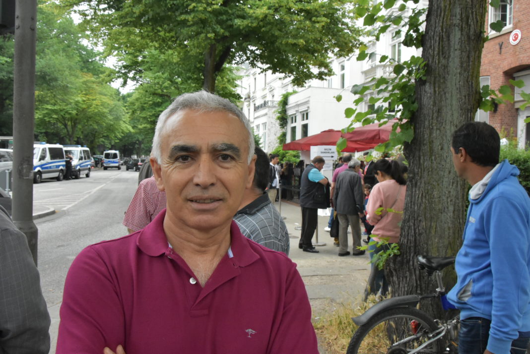 Ali Ülger Hamburg Demokratik Kürt Toplum Merkezi’nin (DKTM) emektarlarından. Alman vatandaşı olduğu için oy kulanamayan Ülker, seçim hazırlıkları boyunca aktif bir şekilde çalıştığını belirtiyor. Sabahın erken saatlerinde itibaren konsolosluk önüne gelen Ali Ülger, seçmen ayırımı yapmaksızın herkese yardımcı olmaya çalışıyor. Ülger, “Tüm baskı, hile ve entrikalara rağmen mutlaka barajı geçeceğiz” diyor.