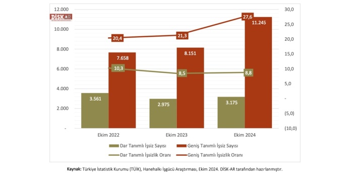 DİSK-AR tarafından TÜİK verilerinden yararlanarak yapılan hesaplamaya göre; mevsim etkisinden arındırılmış geniş tanımlı işsiz sayısı ise Ekim 2024’te 11 milyon 245 bin kişi olarak gerçekleşti. 2022, 2023 ve 2024 Ekim dönemlerinde dar ve geniş tanımlı işsizlik arasındaki makas, genişlemeye devam ediyor. Ekim 2022’de dar tanımlı işsizlik oranı, yüzde 10,3 ve resmi işsiz sayısı 3 milyon 561 bin iken geniş tanımlı işsizlik oranı yüzde 20,4 ve geniş tanımlı işsiz sayısı 7 milyon 658 bindi. Ekim 2023’te dar tanımlı işsizlik oranı, yüzde 8,5 ve resmi işsiz sayısı 2 milyon 975 bin, geniş tanımlı işsizlik oranı yüzde 21,3 ve geniş tanımlı işsiz sayısı yüzde 8 milyon 151 bin oldu. Ekim 2024’te ise dar tanımlı işsizlik oranı yüzde 8,8 ve resmi işsiz sayısı 3 milyon 175 bin iken geniş tanımlı işsizlik oranı yüzde 27,6 ve geniş tanımlı işsiz sayısı 11 milyon 245 bin oldu. Son iki yılda dar tanımlı işsiz sayısı 386 bin kişi azalmış gibi görünse de geniş tanımlı işsiz sayısı 3 milyon 587 bin kişi arttı.