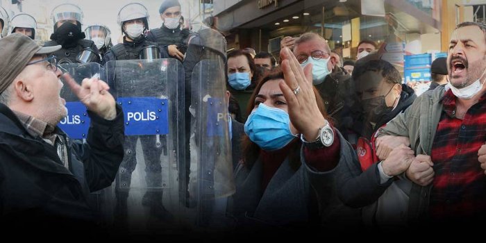 Açıklamaya dakikalar kala HDP milletvekilleri Kemal Bülbül, Hülya Gülistan Koçyiğit, Dilan Dirayet Taşdemir, Nurcan İmir, Dilşat Canbaz Kaya, DBP Eşbaşkanı Saliha Aydeniz, ESP Eşbaşkanı Şahin Tümüklü ve Devrimci Parti Genel Başkanı Elif Torun’un aralarında bulunduğu kitle, HDP binasından sloganlar, alkış ve zılgıtlarla dışarı çıktı. Kitlenin önü 100 metre sonra polislerce kesildi. Karşılaştıkları engellemeye “Faşizme karşı omuz omuza” sloganları atarak tepki gösteren kitleye saldıran polisler, bazı kişileri darp ederek gözaltına alındı. Gözaltına alınanların attığı “Direne direne kazacağız” sloganı o anlarda caddede yankılandı.