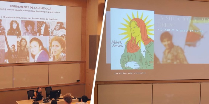 Fransa’nın Lorient kentinde bulunan Bretagne Üniversitesinde Kürt öğrenciler ve dostları tarafından Jineloji ve Kurdistan tarihi ile ilgili bir konferans düzenlendi.