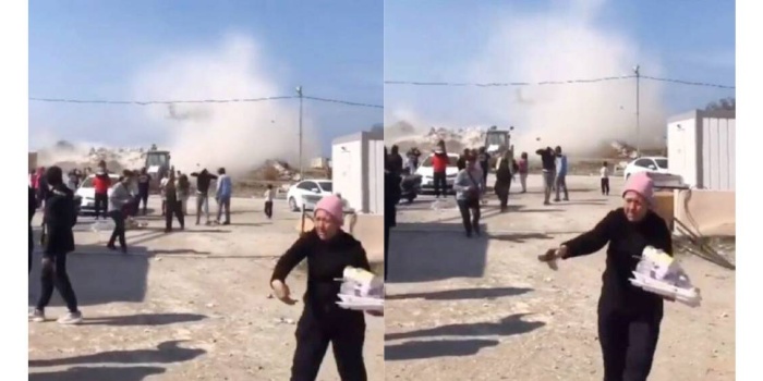 - Bir aydır çadır bulamayan ve mecburen AFAD’ın oluşturduğu çadır kentte yaşayan kadınlardan Leyla Gümüş, çadır kentin önüne dökülen hafriyatların oluşturduğu toz bulutu göstererek, “Depremden ölmezsek de bu hastalık ve tozdan öleceğiz” dedi.