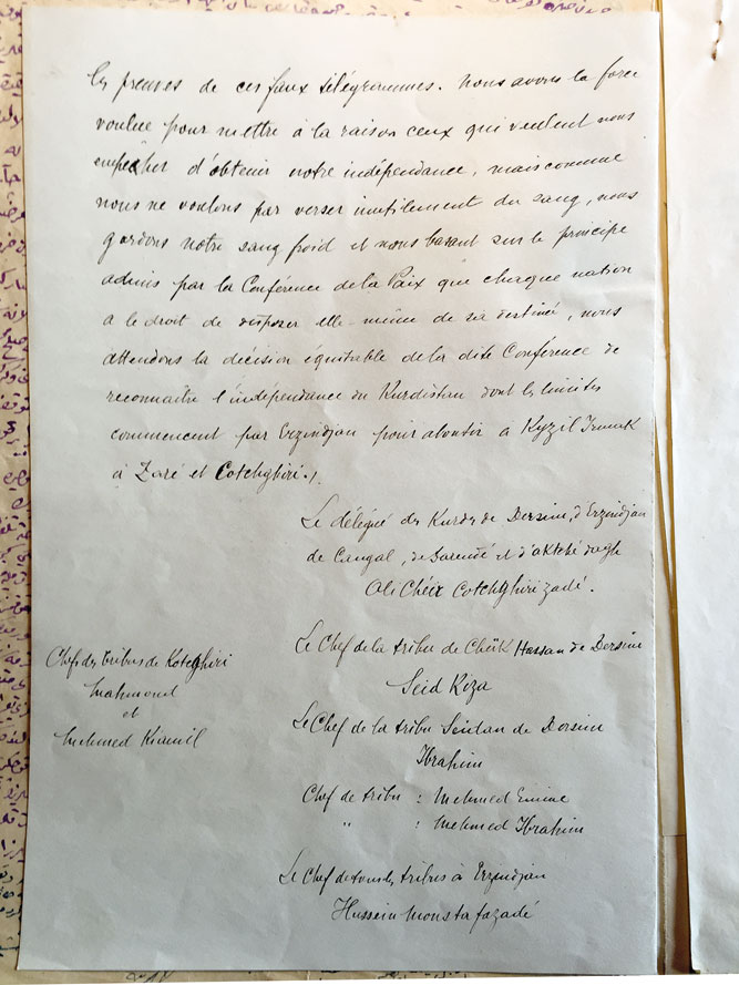 ”Dünyaya malum olsun ki, Kürdistan’ın kuzey hududunda bulunan Erzincan’ın kuzeyindeki dağlarla, Kızılırmak’ın kaynağını oluşturan havzayı teşkil eden Zara, Qoçgirî dahil; Kürdistan’ın tarafınızdan tanınmasını istiyoruz.”