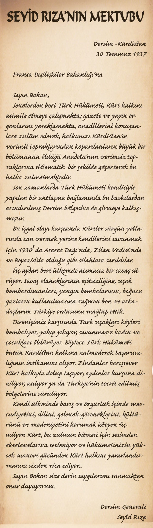 Mektubun önemli bir özelliği de şu: O dönem Sevr Antlaşması gereği, Van Ermenilere bırakılacak. Seyîd Rıza buna da itiraz ediyor aslında. Şunu söylüyor: “Biz Kürt milleti Allah’ın izniyle kendi geleceğimizi ve milli bağımsızlığımızı tayin edeceğiz. Dünyaya malum olsun ki, Kürdistan’ın kuzey hududunda bulunan Erzincan’ın kuzeyindeki dağlarla, Kızılırmak’ın kaynağını oluşturan havzayı teşkil eden Zara, Qoçgirî dahil; Kürdistan’ın tarafınızdan tanınmasını istiyoruz.” Bunu söylerken Seyîd Rıza özellikle şunun altını çiziyor: “Buna Erzincan’ın kuzeyindeki dağlardan tutun, Kızılırmak’ın kaynağı olan havza da Kürdistan’dır.”