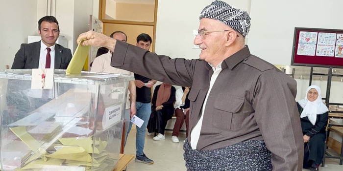 Wan’ın Rêya Armûşê (İpekyolu) ilçesinde 8 yıldır yatalak olan 75 yaşındaki Mahmut Ergin, sabahın erken saatlerinde Niyazi Türkmenoğlu Lisesi’ne gelerek oyunu kullandı. Vücuduna takılı sonda ve tekerlekli sandalyeyle okula gelen Ergin, ailesinin yardımıyla sınıfa giderek oyunu kullandı. Ergin, “8 yıldır yatalağım ama irademle buraya gelerek oyumu kullandım. Ben, artık bize uygulanan bu işkence ve kötülüğün bitmesini istiyorum. Yanımda duran torunum da bizim gibi işkence çekmesin diye geldim. Artık bu ülkenin güzel ve iyi olmasını istiyorum. Tek isteğim bu diktatörlük sona ersin ve herkes huzura kavuşsun. Allah’a çok şükürler olsun ki irademle oyumu kullandım ve mutluyum. Herkes sandıklara giderek oy versin” dedi.