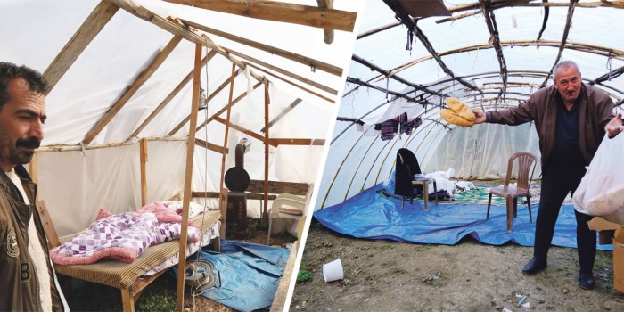 Yaşadıkları serada toplu görüntü vermek istemeyen aile fertlerinden Sinan Dağlıoğlu, "Devletten çadır gelmedi. Hayırseverler yardım getirdi. En büyük sıkıntımız çadır” dedi.