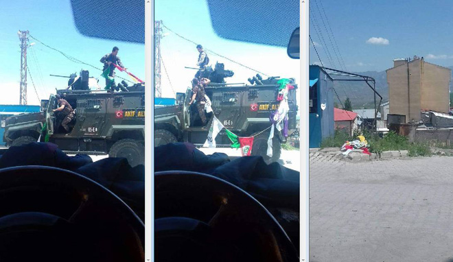Başkale ilçe merkezine asılan HDP flamaları zırhlı araçlı polisler tarafından sökülerek çöpe atıldı. Van'ın Başkale ilçesinde asılan HDP flamaları zırhlı bir aracın içerisinden çıkan özel harekat polisleri tarafından söküldü. Kullandıkları zırhlı aracın üzerine çıkan polis, yol boyunca asılan HDP flamalarını tek tek indirerek çöpe attı.