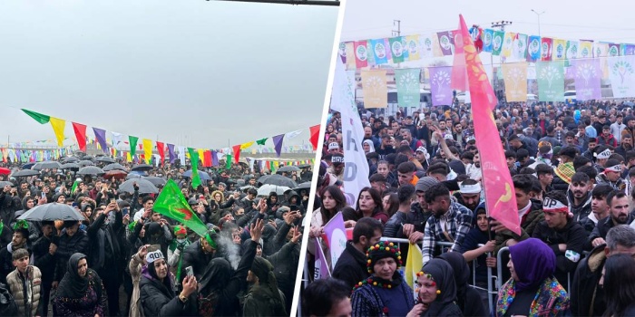 Gever'de yağışlı ve soğuk havaya aldırış etmeyerek, Newroz alanını dolduran binler, Öcalan'ın fiziki özgürlüğünü haykırarak, "Hükümet istifa" sloganı attı.