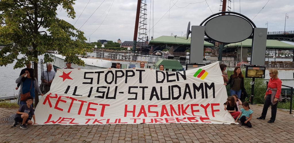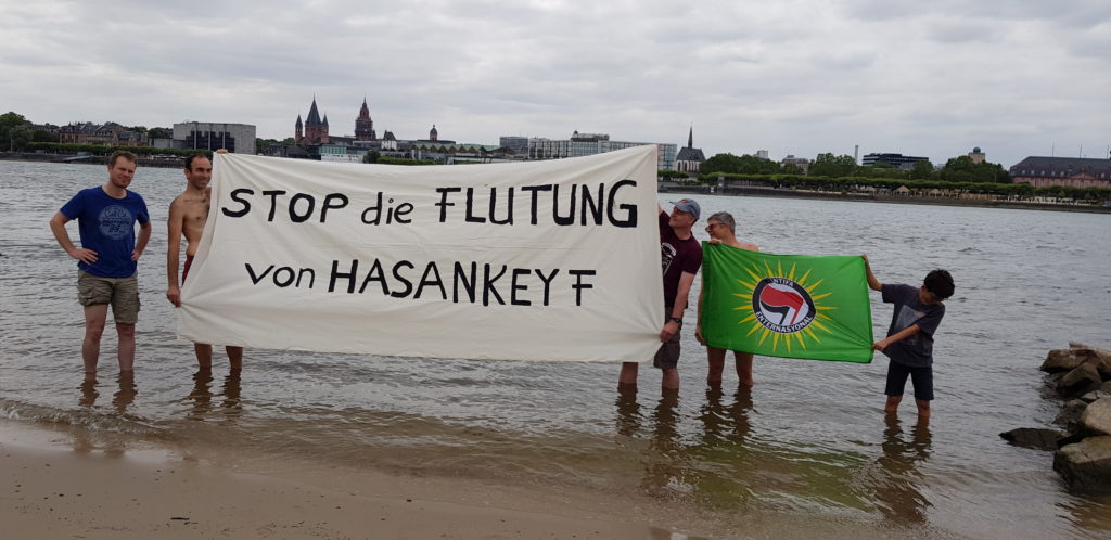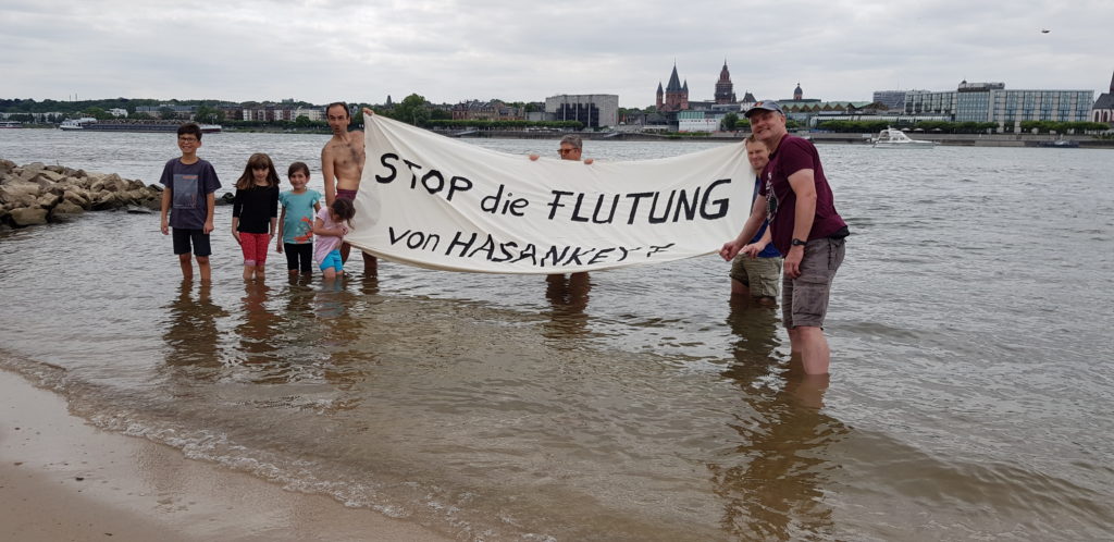 Tarihi Hasankeyf’in sular altında bırakılmaması için dünyanın birçok yerinde çeşitli eylem yapılırken, Almanya’nın Mainz kentinde ise Rojava İnitiative Mainz aktivistleri tarih yıkımına karşı Rhein Nehri’nin keneranda pankart açtı. Hasankeyf’e karşı duyarlılığı arttırmak için Rhein Nehri’ne girerek pankart açıp 3 aktivistte nehirde yüzdü. MAİNZ