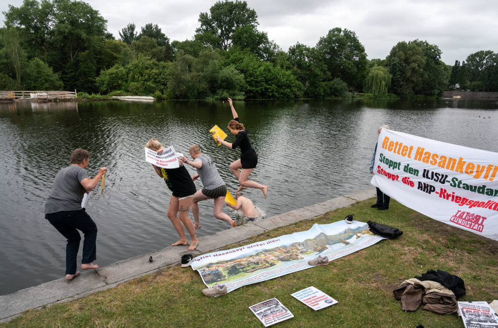 Hasankeyf’e gidemeyenlerin İstanbul’daki durağı ise Sarıyer Yeniköy’deki Avusturya Başkonsolosluğu’nun önü oldu. Konsolosluk önünde toplanan yurttaşlar basın açıklanmasının ardından sloganlarla denize atladı.