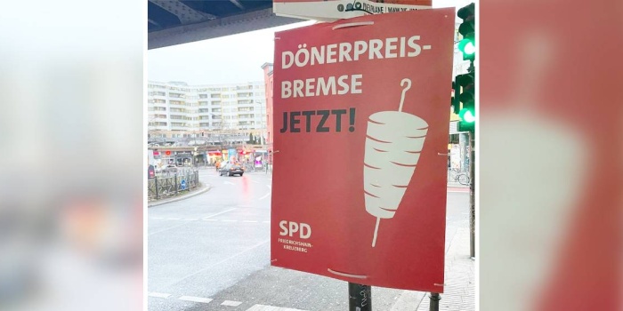 - Başkent Berlin'de 12 Şubat'ta yapılacak yerel seçimler öncesinde Almanya Sosyal Demokrat Partisi (SPD) ilginç bir afiş çalışması yaptı. Friedrichshain-Kreuzberg bölgesinde asılan döner resimli afişlerde "Döner fiyatları hemen düşürülsün!" ifadesi yer aldı.