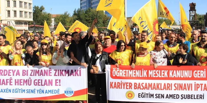 Amed'de iş bırakan eğitim emekçileri, Ali Emiri İlkokulu’nun önünde bir araya gelerek, Şeyh Said Meydanı’na kadar yürüdü. Eyleme KESK’e bağlı sendikalar, DİSK, HDP, TİP, EMEP ve CHP de destek verdi. Kürtçe “Ana dilde eğitim bütün halkların hakkıdır” pankartı açan emekçiler, sık sık “Bijî berxwedana kedkaran", "Perwerdehiya ziman mafê me ye" ve “Emekçiyiz, haklıyız, kazanacağız” sloganları attı.