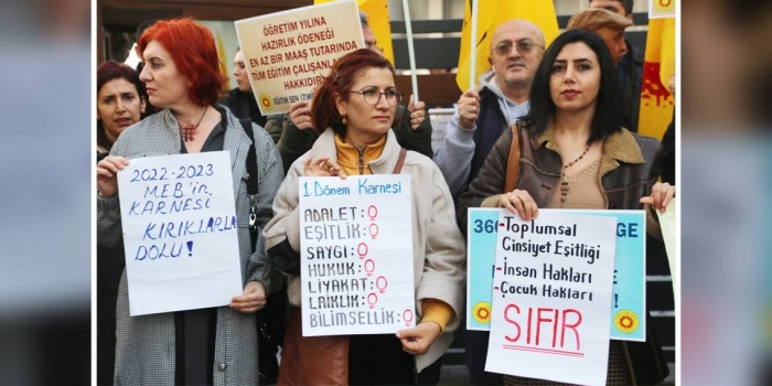 Eğitim ve Bilim Emekçileri Sendikası (Eğitim Sen) İzmir Şubeleri, 2022-2023 eğitim ve öğretim yılının ilk dönemine dair İl Milli Eğitim Müdürlüğü önünde açıklama yaptı. "ÖMK eşitsizliğini karşı eşit işe eşit ücret istiyoruz" pankartının açıldığı açıklamada, sık sık "Sermayeye değil eğitime bütçe", "Eşit işe eşit ücret" ve "Laik, bilimsel, demokratik eğitim" sloganları atıldı.