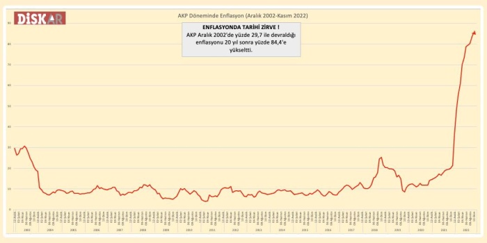 Kasım 2022’de yüzde 84,4 olan resmi enflasyon oranı AKP dönemi için yeni bir rekor anlamına geliyor. Aralık 2002’de yüzde 29,7’lik bir enflasyon devralan AKP, 20 yılda enflasyonu 55 puan artırmış oldu.