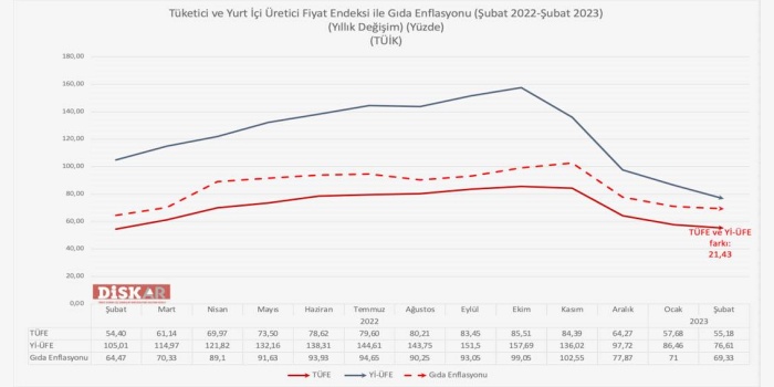 TÜİK, TÜFE’deki (2003=100) değişimi, Şubat 2023'te bir önceki aya göre yüzde 3,15, bir önceki yılın aralık ayına göre yüzde 55,18 ve 12 aylık ortalamalara göre yüzde 71,83 olarak duyurdu. TÜİK’e göre Yurt İçi-Üretici Fiyatları Endeksi (Yİ-ÜFE) (2003=100) ise Şubat'ta bir önceki aya göre yüzde 1,56 puan artarak yıllık yüzde 76,61 olarak gerçekleşti. TÜFE ile Yİ-ÜFE arasındaki makas, Şubat 2023’te 21,4 puan olarak gerçekleşti.