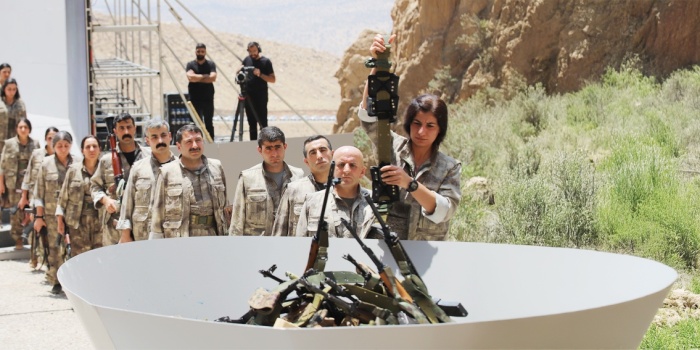 Silêmanî kenti kırsalında bulunan Şikefta Casenê’de 11 Temmuz’da 30 kişilik gerilla grubunun silahlarını imha törenini izleyenler arasında, evlatlarını, yakınlarını kaybeden Barış Anneleri de vardı.