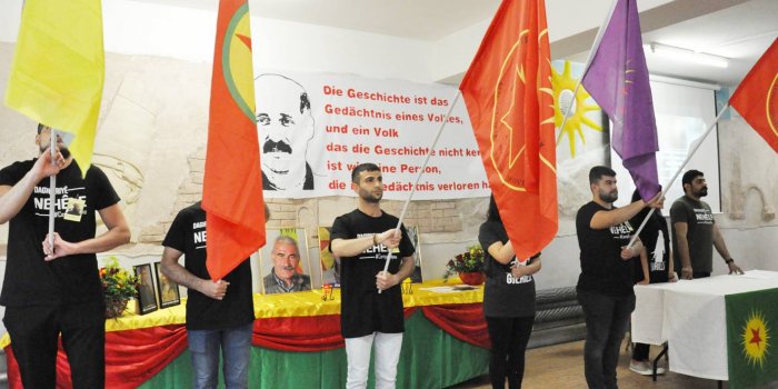Yürüyüş boyunca sık sık Almanca ve Kürtçe, ‘Bijî Serok Apo’, ‘Öcalan’a Özgürlük ve 27 Mayıs’ta Türk hava saldırısında şehit düşen PKK MK üyesi Kasım Engin anısına ‘Şehîd namirin’ sloganları atıldı.